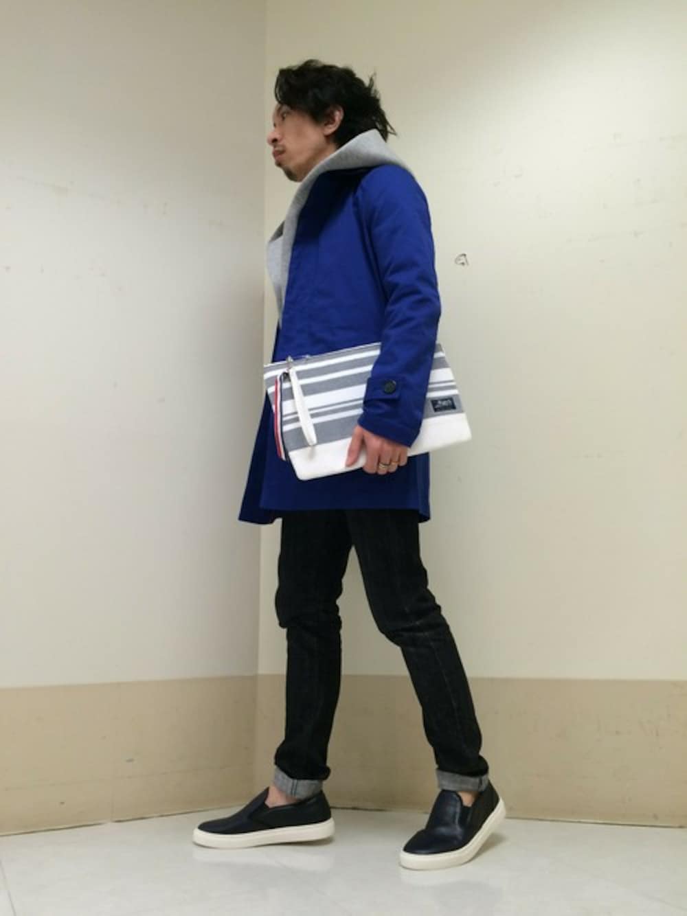目を惹くビビッドなブルーのスプリングコートに、ビッグフードをあわせて顔まわりにボリュームをもたせて目線を上にして、細身のパンツを組み合わせれば、スタイルアップ効果が♪ 足元はきれいめリラックスなレザースリッポンがおすすめです☆