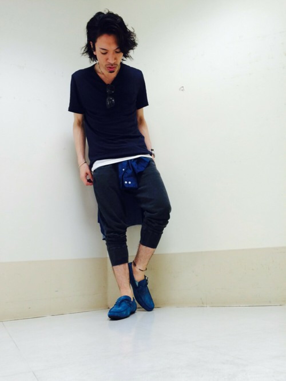 ブルーグラデのリラックスサマーカジュアルです♪ 日中は、麻100%の清涼感たっぷりで着心地がさらっとしているTシャツで過ごし、陽が落ちたら腰に巻いているシャツで気温調節♪ 胸元にさした伊達メガネはUV対策にも♪ ジャストシーズンのライフスタイルにぴったりなコーディネートです。