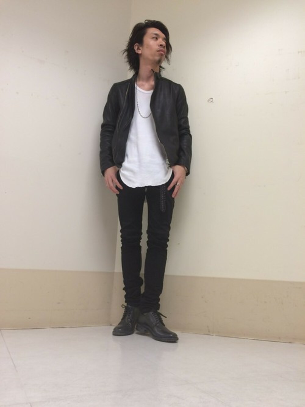 ハードな印象のレザーダブルライダースを今年風に、ロングのカットソーと黒スキニーでモノトーンにまとめました☆ 足元にはレザーのシューズをもってきて、レザーサンドイッチ笑