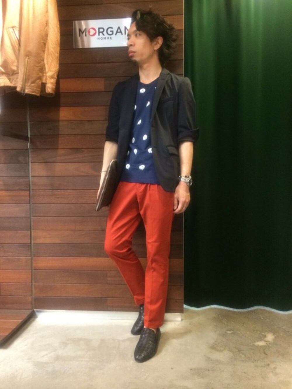 七分袖の軽やかなジャケットにクロップドパンツをあわせた軽快なきれいめスタイルです。 全体を落ち着いたアイテムでまとめ、インナーにミッキードットをはずしに使ってます。