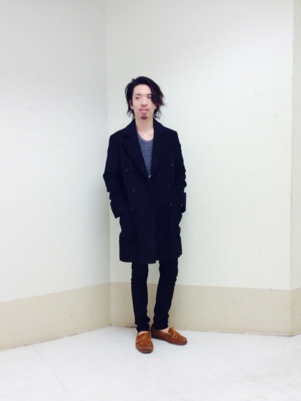 丈長のウールコートはスキニーでシルエットをバランスよく☆ あまりカチッとしすぎないように差し色でカジュアルダウン。 ドライブデートにもおすすめ♪