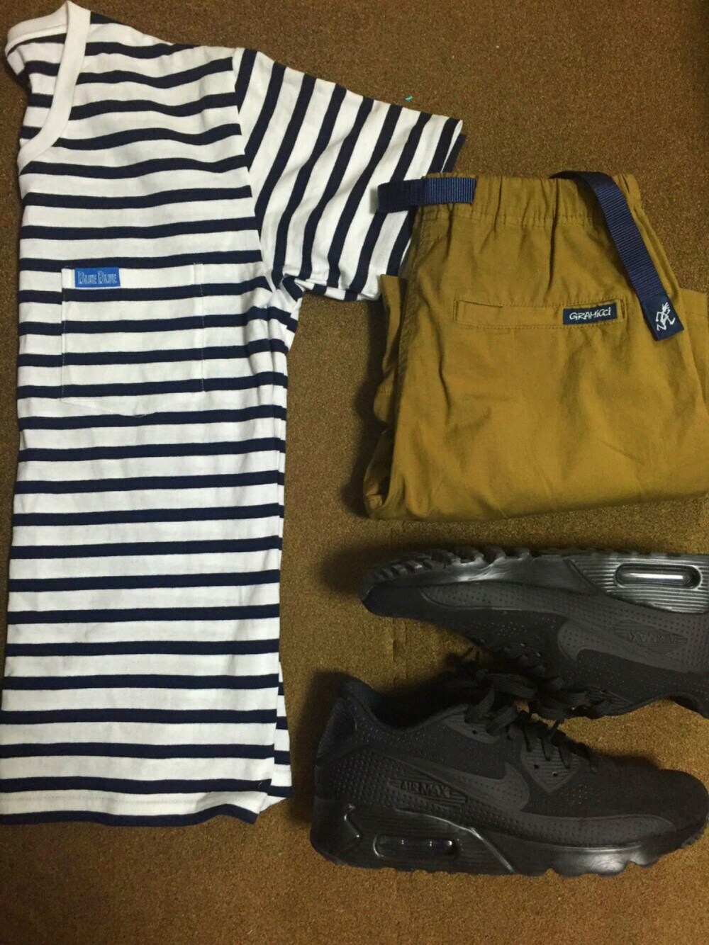 グラミチのパンツは履き心地いいですね。 お気に入りです! Tシャツはパックで売られてるもので 手軽に買える値段なので重宝してます! Tシャツ blueblue sサイズ 靴 エアマックス90ウルトラモアレ 27cm