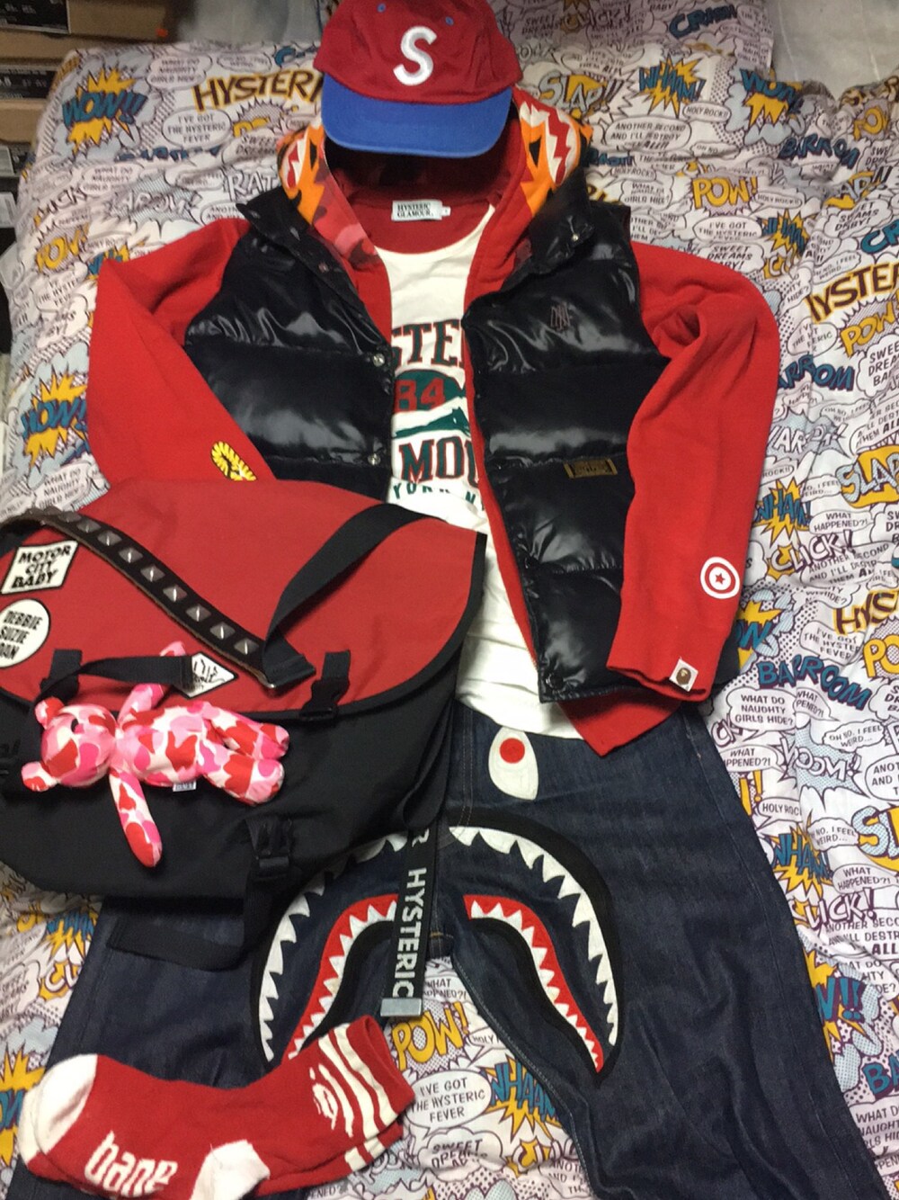 おはようございます♪ NEIGHBORHOODのダウンベストとA・BATHING APEタイガーカモパーカーにシャークデニムを使っての赤コーデです〜♪