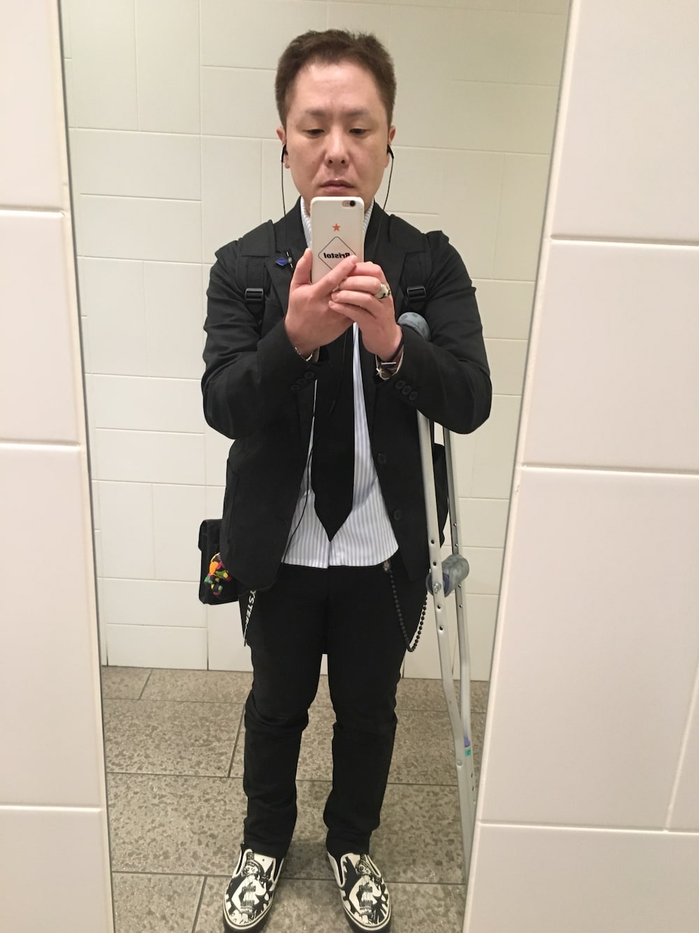 ご覧頂きありがとうございます〜♪ 今日からヨレヨレと職場復帰でした〜♪ と言っても私服でいい所なんで見た目スーツセットアップですがMILKBOYのオフコーデです〜♪ ホントは松葉杖無しでも自力でぴょこぴょこ歩けるのですが護身用に松葉杖片方だけ持ち歩きます〜♪ そして帰りはあんよがヅキヅキ痛むので片松葉杖でヨレヨレと歩いてます〜ッ(´-ω-`)