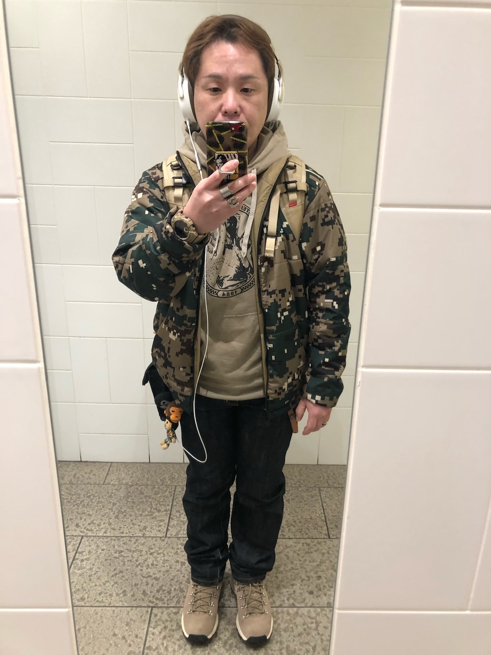 名和 賢悟のブルゾン「REVERSIBLE CAMOUFLAGE PADDED BLOUSON」を使ったコーディネート