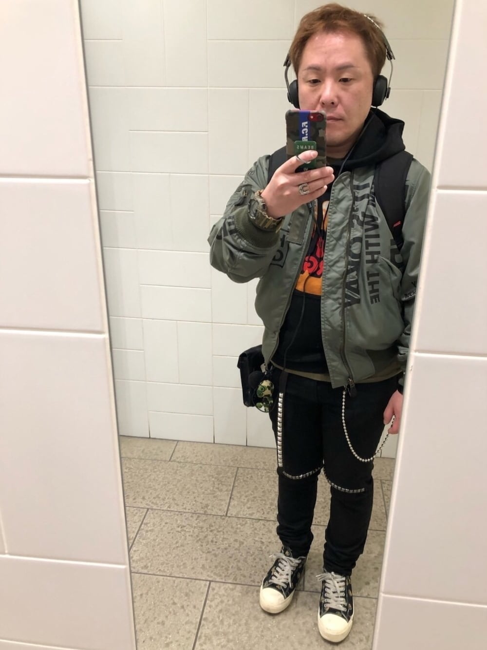 名和 賢悟のミリタリージャケット「エアフォース LOGO SCRATCH MA-1ジャケット」を使ったコーディネート