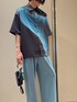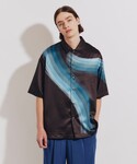 カーブしたグラデーションが目を引く半袖シャツをメインにコーディネートしてみました。 グラデーションのカラーに合わせてペールグリーンのワイドパンツを合わせれば、見た目も涼し気な印象に。 真夏はシャツのインナーにタントップを合わせて羽織で着用頂くのもオススメです。