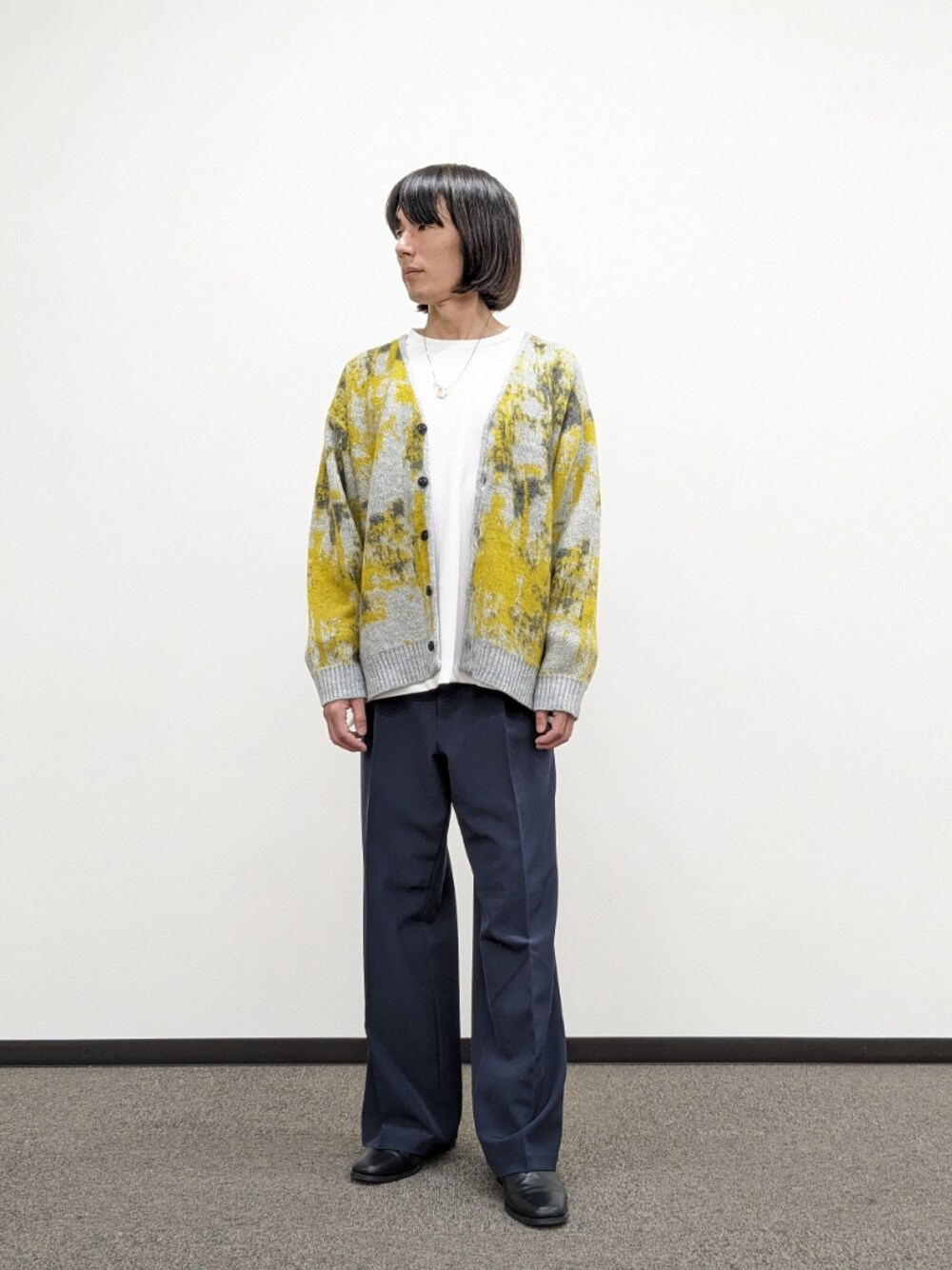 シャギーニットカーディガンを使ったコーディネートです♪ イエローが目を引くカーディガンはできますインナーとしてもオススメです♪