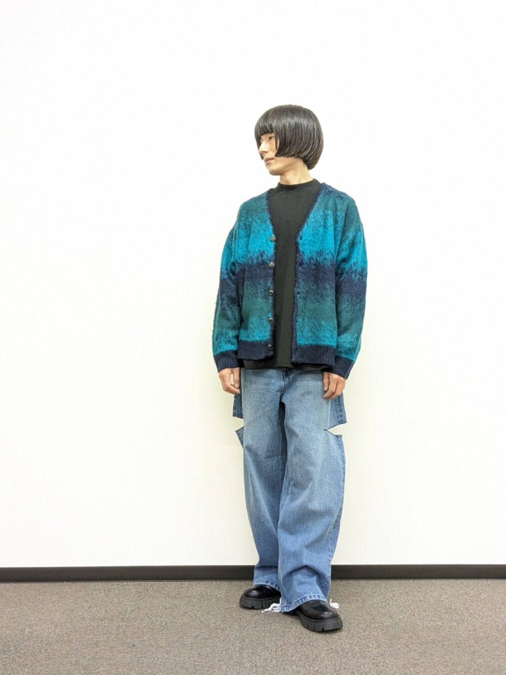 シャギーニットカーディガンを使ったコーディネートです♪ ダメージデニムを合わせて、旬なコーディネートを意識しました♪