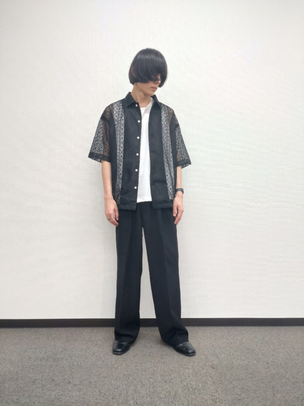 メッシュ生地のような生地感が涼し気なシャツを主役にコーディネート♪ 風通しが良く、夏場は活躍間違いなしですね♪ インナーはタンクトップがオススメです♪