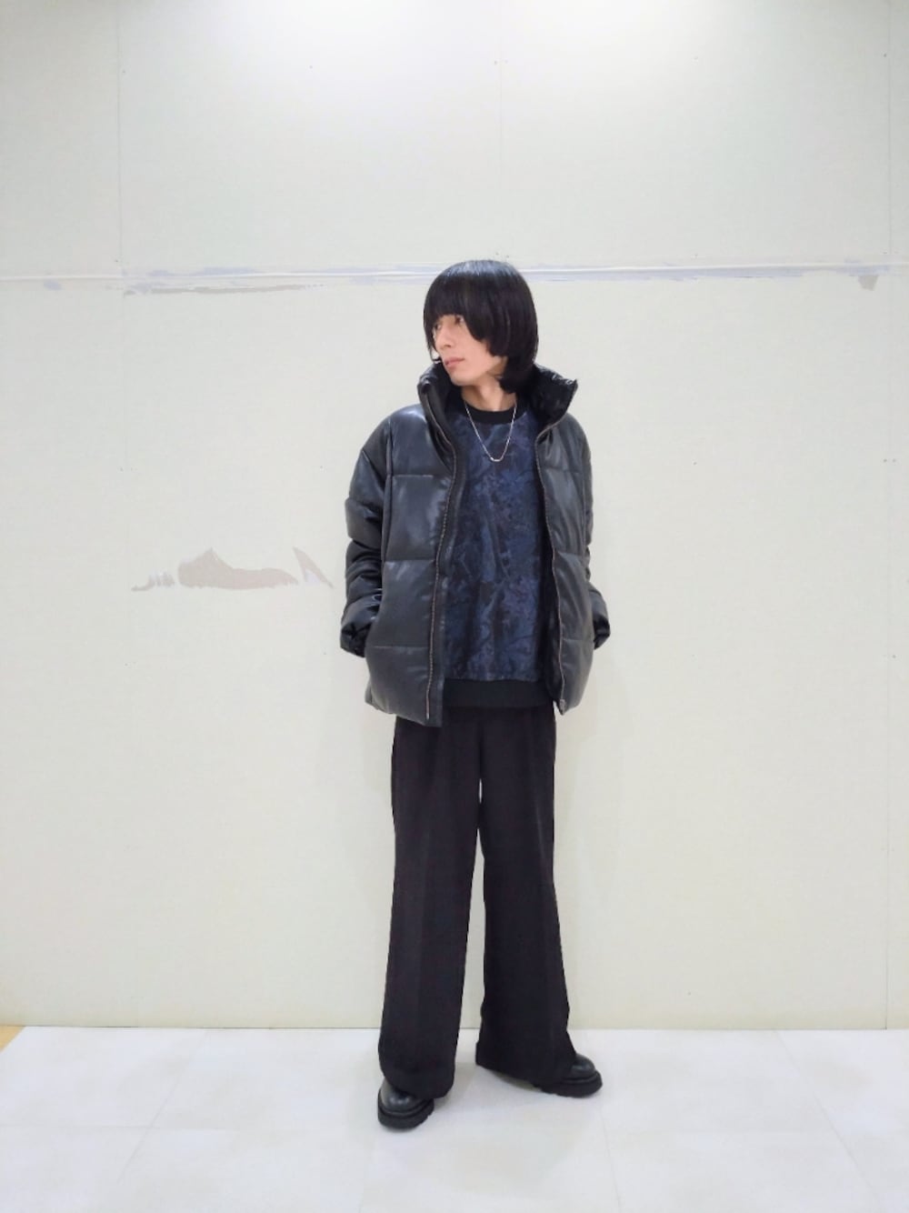 レザー調中綿ブルゾンを使ったコーディネート。 フレアスラックスを合わせて綺麗にコーディネートしました♪
