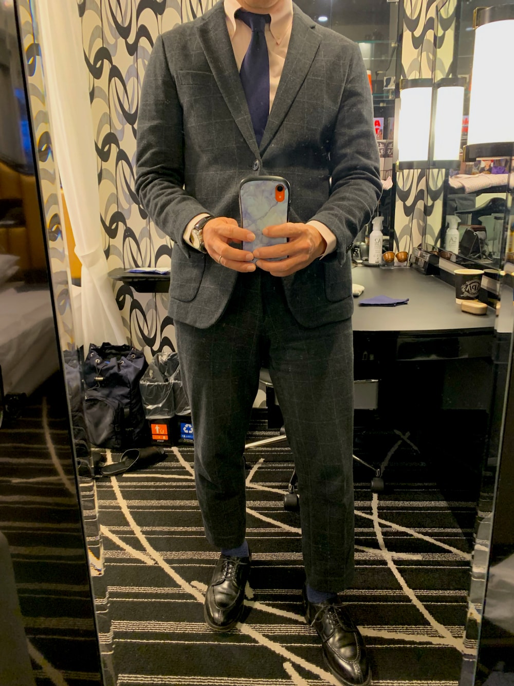 ストレッチコンフォートのセットアップ。今日は気の知れた方ばかりの来客なのでこのような感じですが、TPOでしっかりしたスーツも着るべきだと思います。