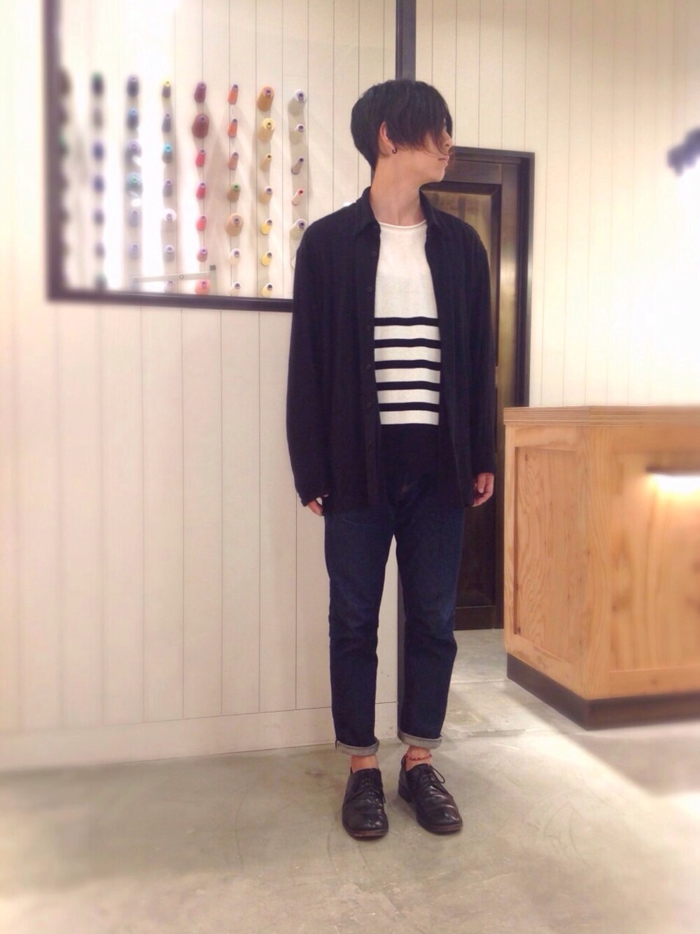 ブラックの緩めシャツですけど麻で作られてますのでこれからの季節にピッタリ!軽さを出す為にやや足元は足首を出して!