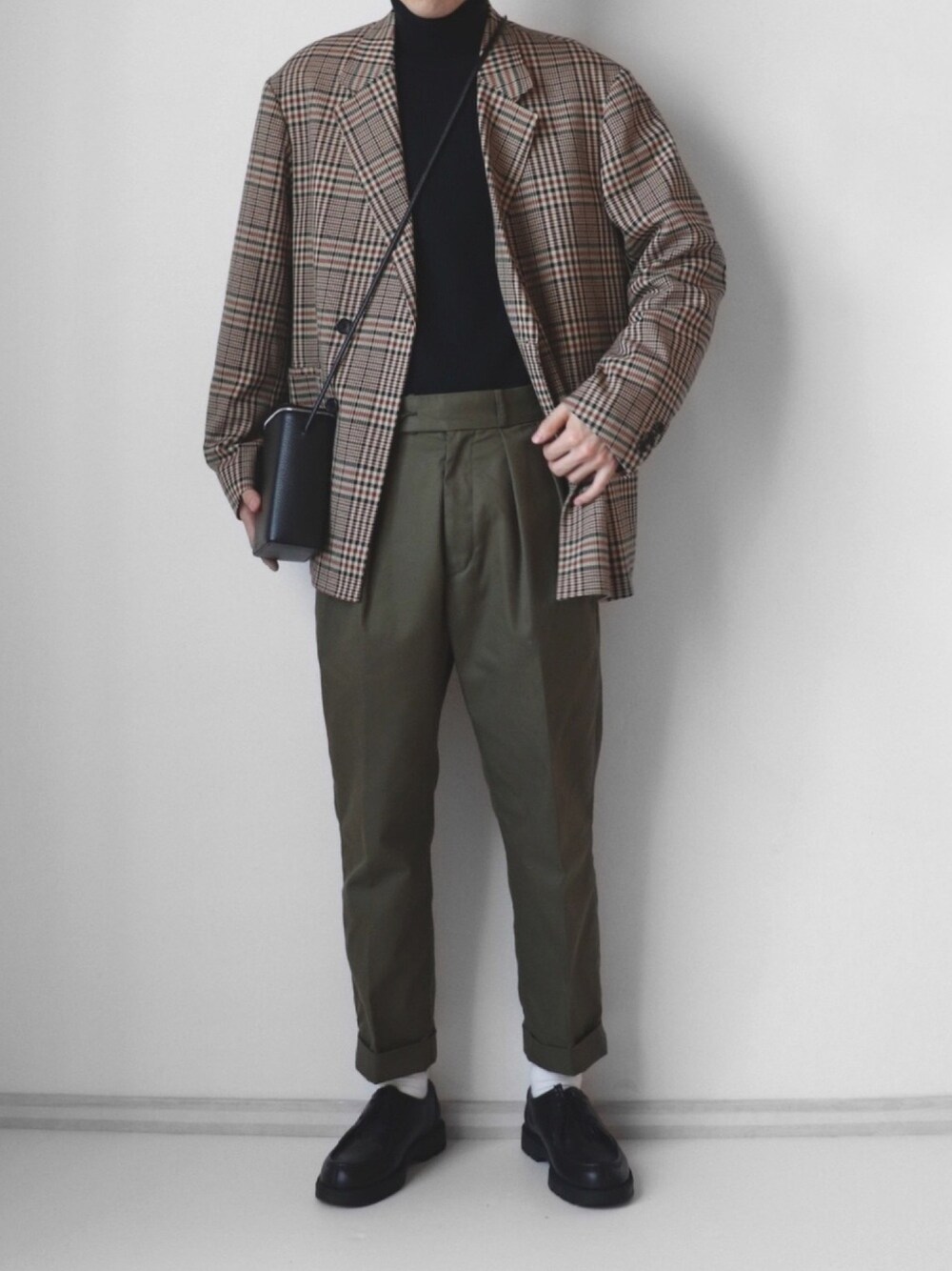 今回は珍しくジャケットコーデ。 チェックのジャケットは着こなしがかなり難しいんですが、アースカラーのアイテムと合わせるのがオススメです。 ミスオリのパンツはタックインして履くとかなり綺麗に見えます😄