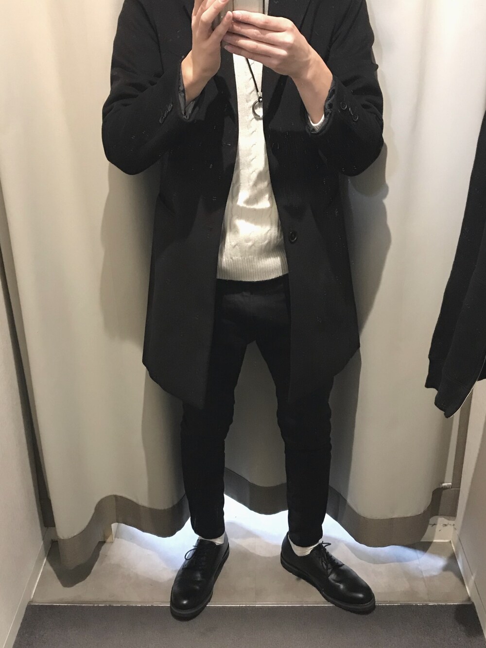大好きな白黒コーデです! スキニーパンツと革靴の相性がとても良くて気に入っています! 靴下の色は白にこだわらず、赤や黄色などワンポイント違う色があってもいいと思います! コートのアウターonアウターにも挑戦してみたいです…
