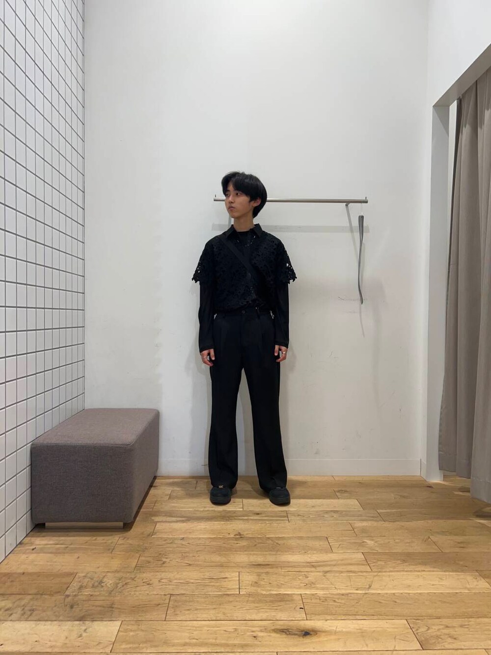 今回はブラックでまとめたシックなカジュアルコーデです! レースのトップスが程よく抜け感を出し、シアーのロンTとの重ね着で個性をプラス。 フレアスラックスはリラックス感がありつつも、落ち感のある生地で上品な印象に仕上がっています。 きれいめとラフさをミックスさせた、大人の余裕を感じるスタイルです! ぜひ試してみてください!