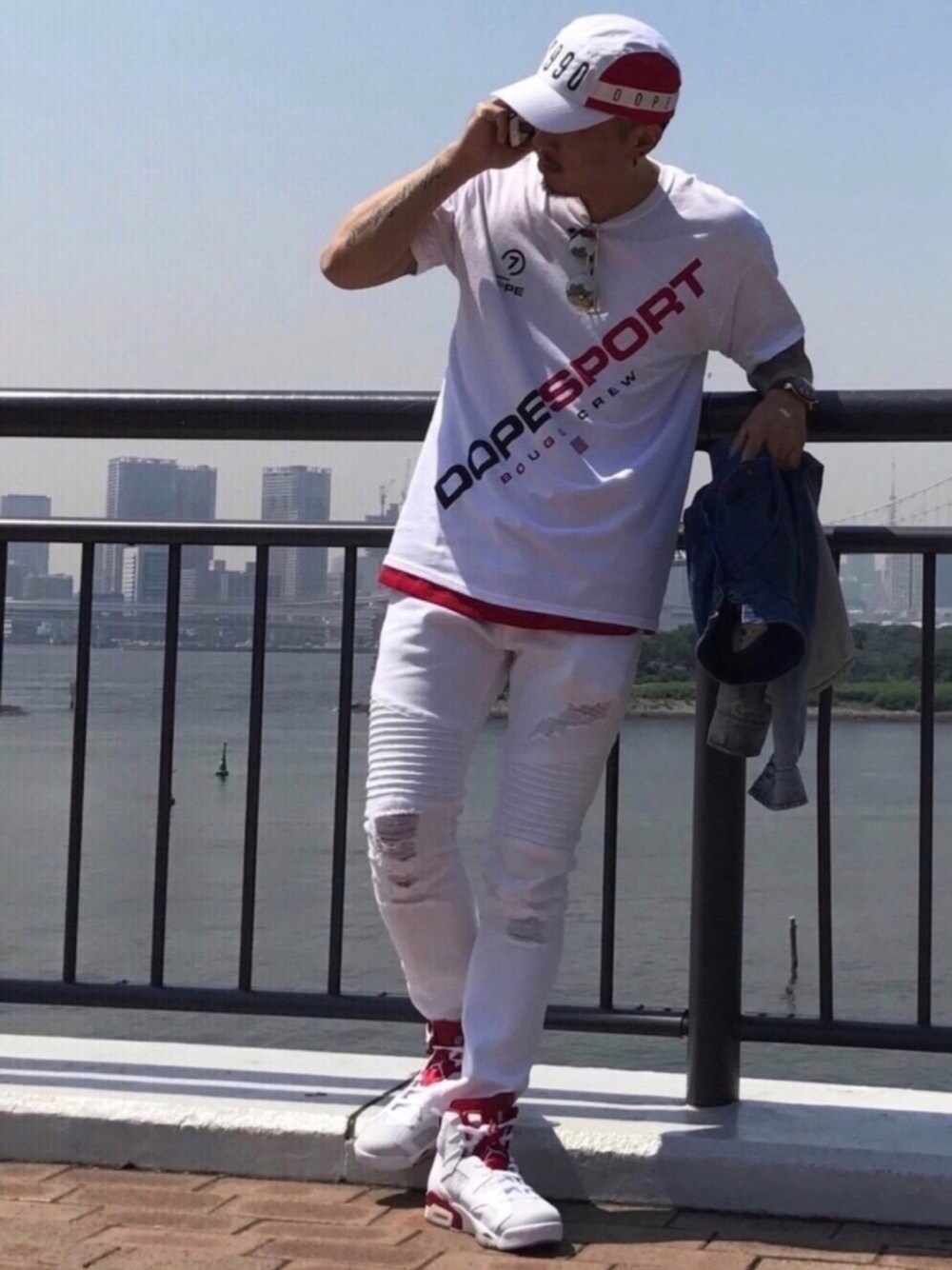 こんにちは💛 東京は👍🏽 本日も晴天でとても夏らしい陽気でしたよ➰☀️ ☀️ ☀️ そんな今日も先週に引き続き… お台場までツーリングがてらショッピングへ行ってきました😁🎶 さっそく購入したてのキャップとTシャツをベースに👍🏽 コーディネートを組んでみました🤔 意外に… DOPEブランドは初で。。たまたま入ったお店でDOPEのキャップに一目惚れをしてしまい😍 Tシャツも合わせて購入することに‼️ww トップス&パンツが白なので… デニムシャツを腰へ巻くか。。などいろいろ考えましたが💭 結局⏩赤のシャツをインしてトップスとパンツの区切りにメリハリをつけてみました✔️ シューズは久しぶりに愛用のJORDAN6です😙👌🏽🎶 最後になりますが。。最近は嬉しい事に… ちょくちょくフォロワーの方も増えてきて嬉しい限りの自分でした😊✨ いつも観覧してくれる皆さん⭐️✨ 仲良くしてくれるフォロワーの皆さん⭐️✨ 本当に… ありがとうございますね💐✨ 仕事が不規則だったりするので… 皆さんへコメントなどさせてもらう時間帯がまちまちだったりするかもしれませんが🗯 ご了承して頂ければと思っております😣🙏🏽💦 今後とも、宜しくお願い致します✨👏🏽✨👏🏽✨