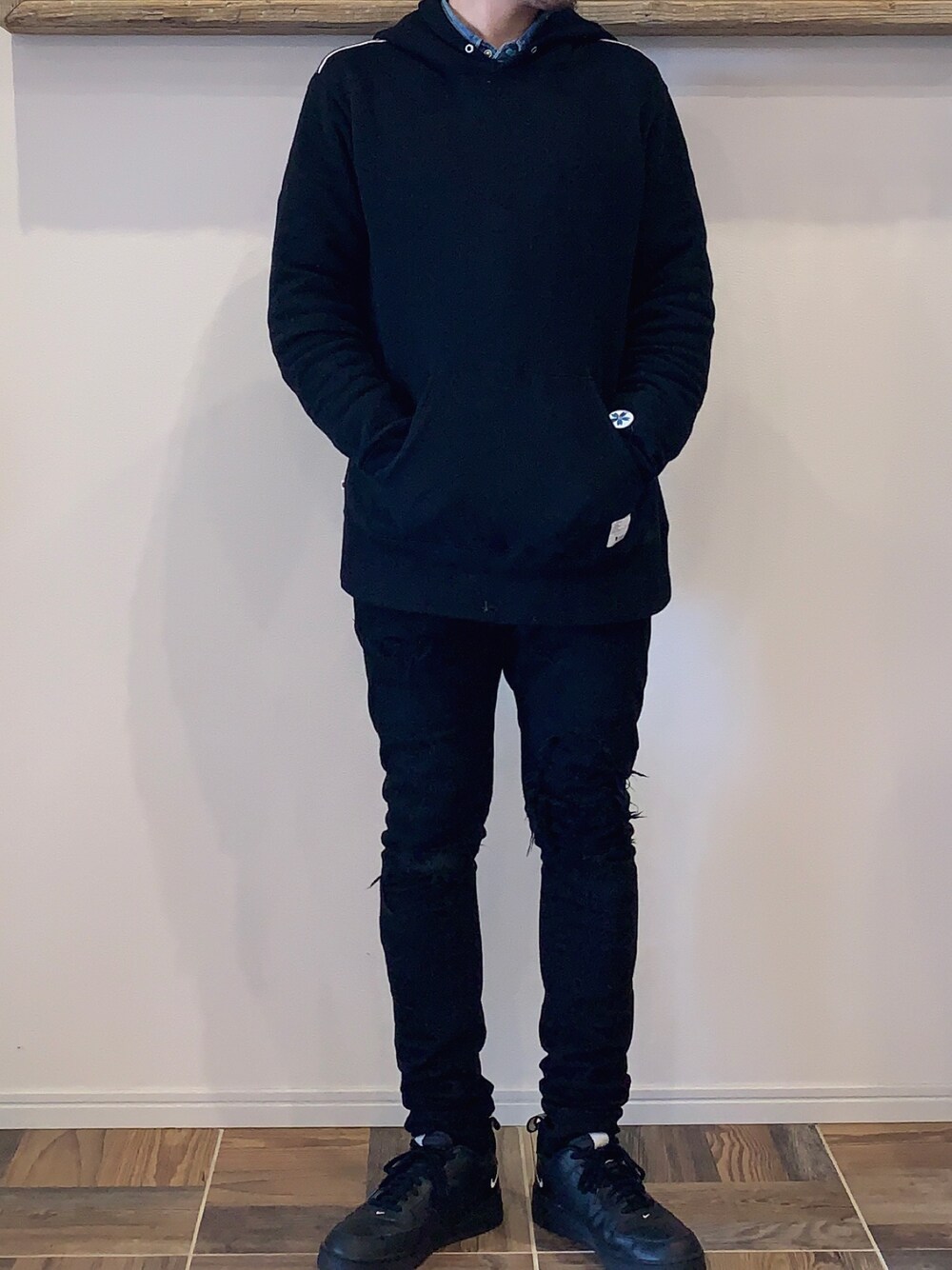 ブラックコーデ ☑︎Point ・オーバーサイズのパーカーに細いスキーニーでYライン。 ・スキニーはただの黒パンではなく、ハードダメージで個性的に。