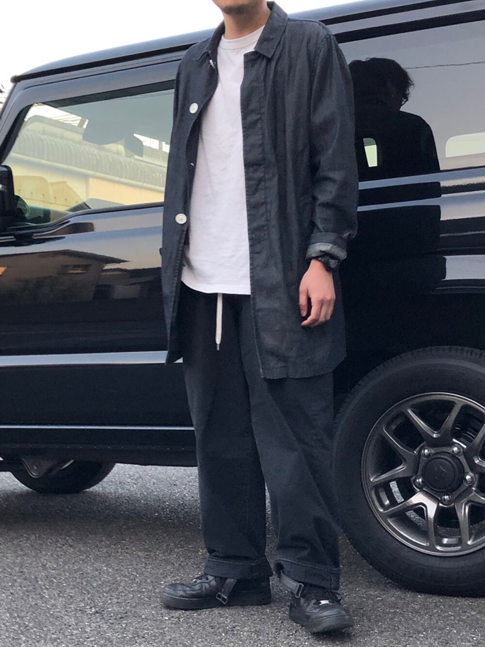 Point☑︎ ショップコートと太めのパンツの組み合わせ。 ブラック系と白の#モノトーンコーデ 。 tops:#urbanresearch_id #ショップコート tops:#uniqlou #tシャツ bottoms:#rotol #黒パン shoes:#nike #airforce1 #yesnike