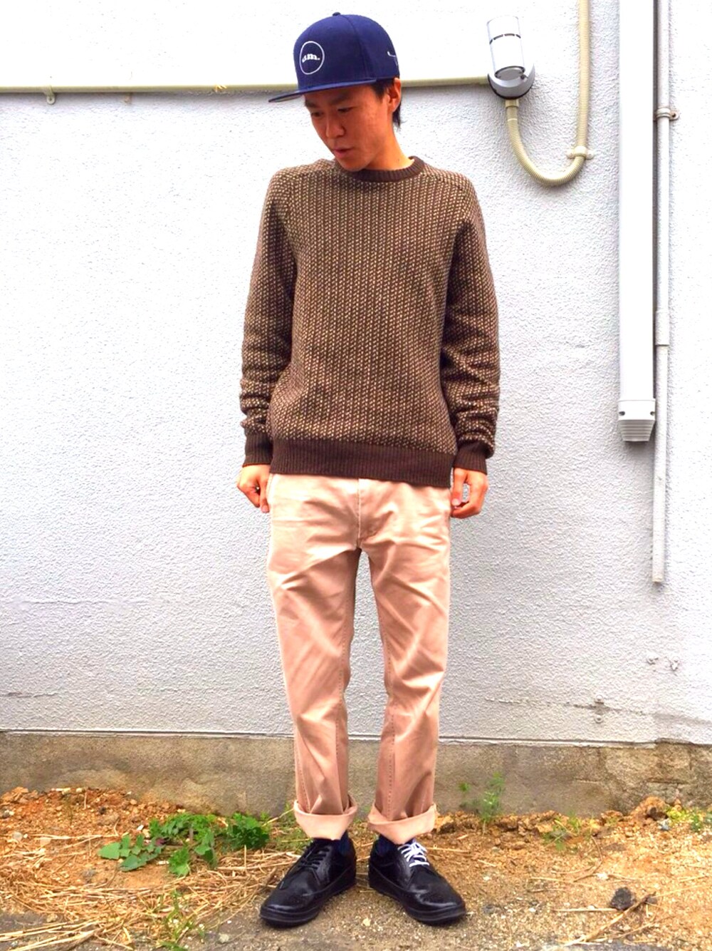 ブラウン系のニット/セーター、ブラック系のドレスシューズ、ブルー系のキャップを着用したメンズの冬コーディネートの1枚目の写真