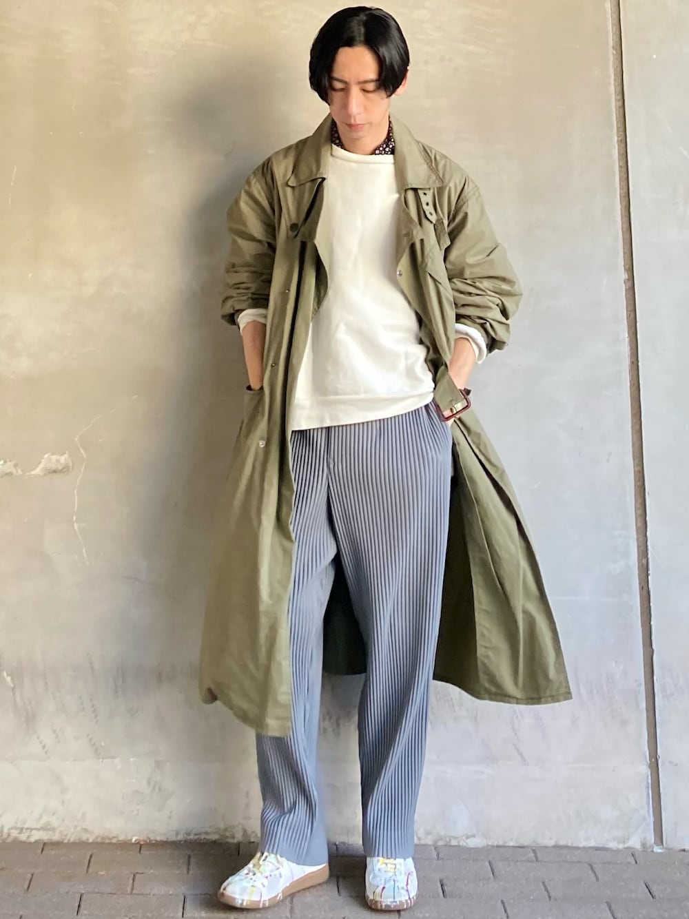 最近は太陽の気持ちの良い日も増えてきましたね☀️ 【モーターサイクルコート】 Barbour バブアー 薄手のコートをガバッと羽織って日差しの下を颯爽と歩きたいですよね!(実際は子供たちと手を繋いでテクテク歩いています🚶♂️笑)あとは重たい印象のコートは袖まくりして軽やかに。白インナーの袖をちょこっと巻き込んでやって爽やかさUP☝️? 【プリーツパンツ】 hommeplisse オムプリッセ シルバーグレーのプリーツパンツはモードな印象を残しつつ暗くなり過ぎないので重宝しています🌟 【スカーフ】 vintage ヴィンテージ 洒落感が欲しいときに重宝するのがこの柄スカーフ。全体的に明るめなスタイリングなので、黒をポイントに入れた引き締め効果も期待出来ます😋 sweatshirts:wellder ウェルダー shoes:maisonmargiela メゾンマルジェラ watch:fhb ring:emanuelebicocchi
