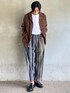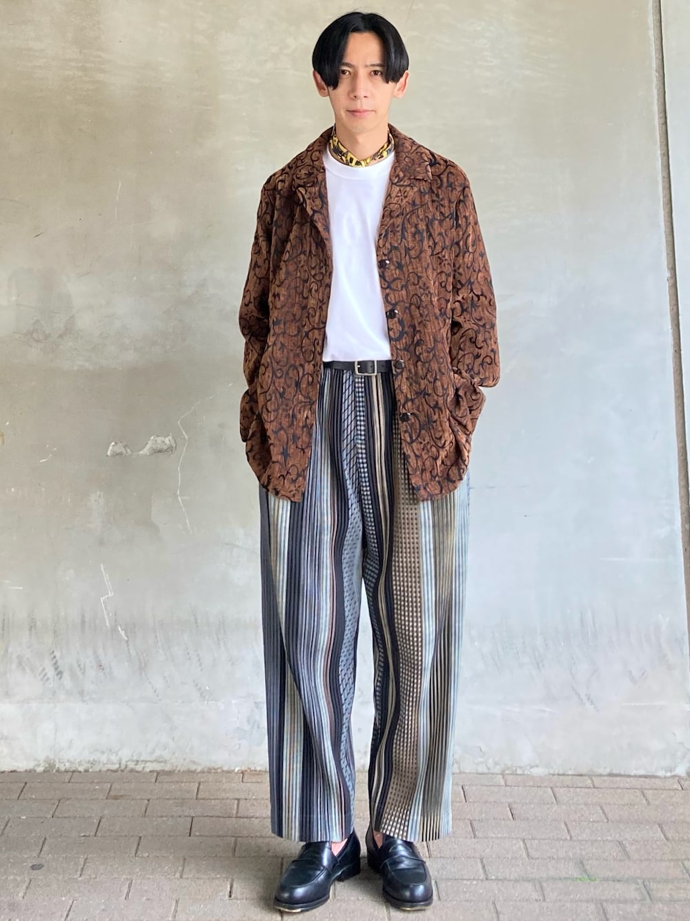 New styling with the “Gobelin jacket” ・ 古着のゴブランジャケットと柄のプリーツパンツであえてキメ感のあるスタイリングを🧥 “柄×柄”のスタイリングも同系色でまとめることで違和感なく馴染んでくれますよね😊 あとは黄色のスカーフとサーモンピンクのソックスを差し色にしてみました🧦 ソックスは「インターナショナルギャラリービームス」のオリジナルアイテムで、肌馴染みの良いピンクの発色が気に入っています✨ jacket :vintage t-shirts:hanes pants:hommeplisse sacrf:tomorrowland socks:internationalgallerybeams loafers:f.lli giacometti