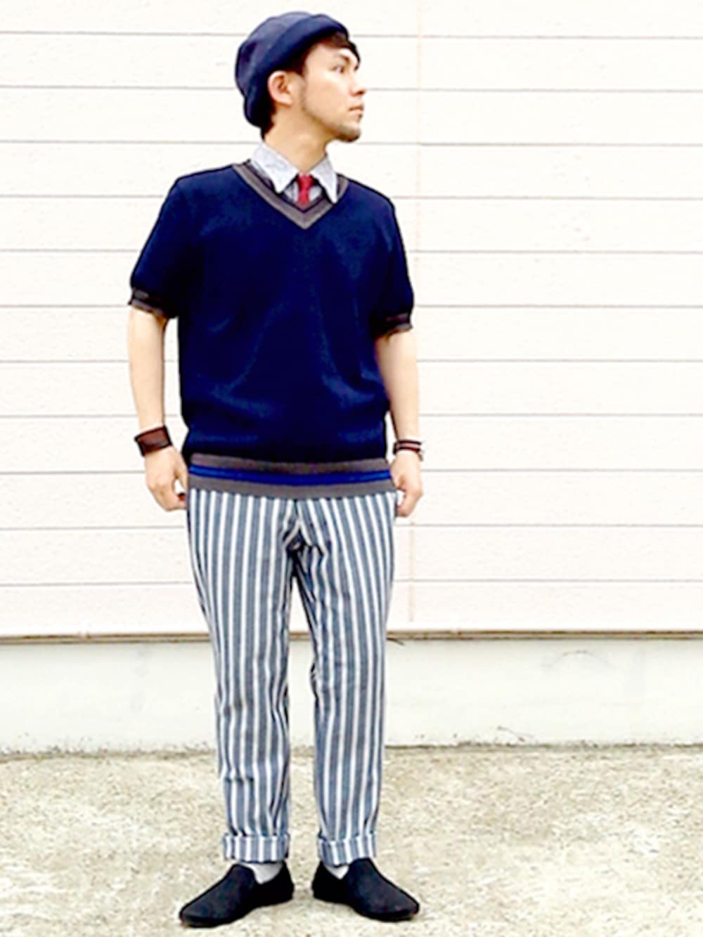 ストライプパンツコーデ☆ 全体的にはネイビー×レッドっていう 定番の配色にまとめてあります。 最近家でエアロバイクやってるんですけど 継続できる気配が全くしません。。。
