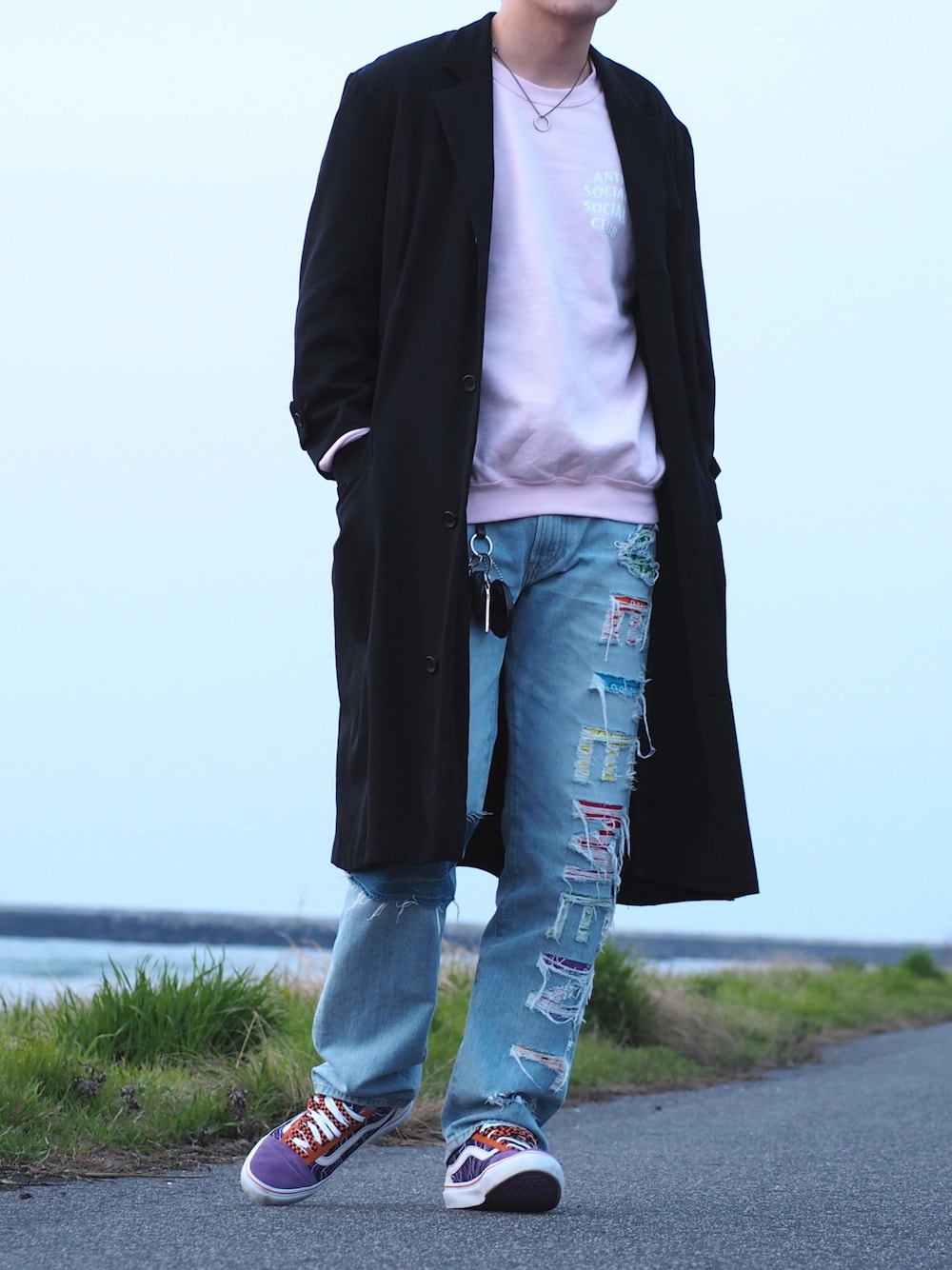 UNIQLOのデニムをリメイクしました ダメージで字を書き、裏からバンダナを当て、違う色のデニムを膝に貼りました。 愛着もあり気に入ってます