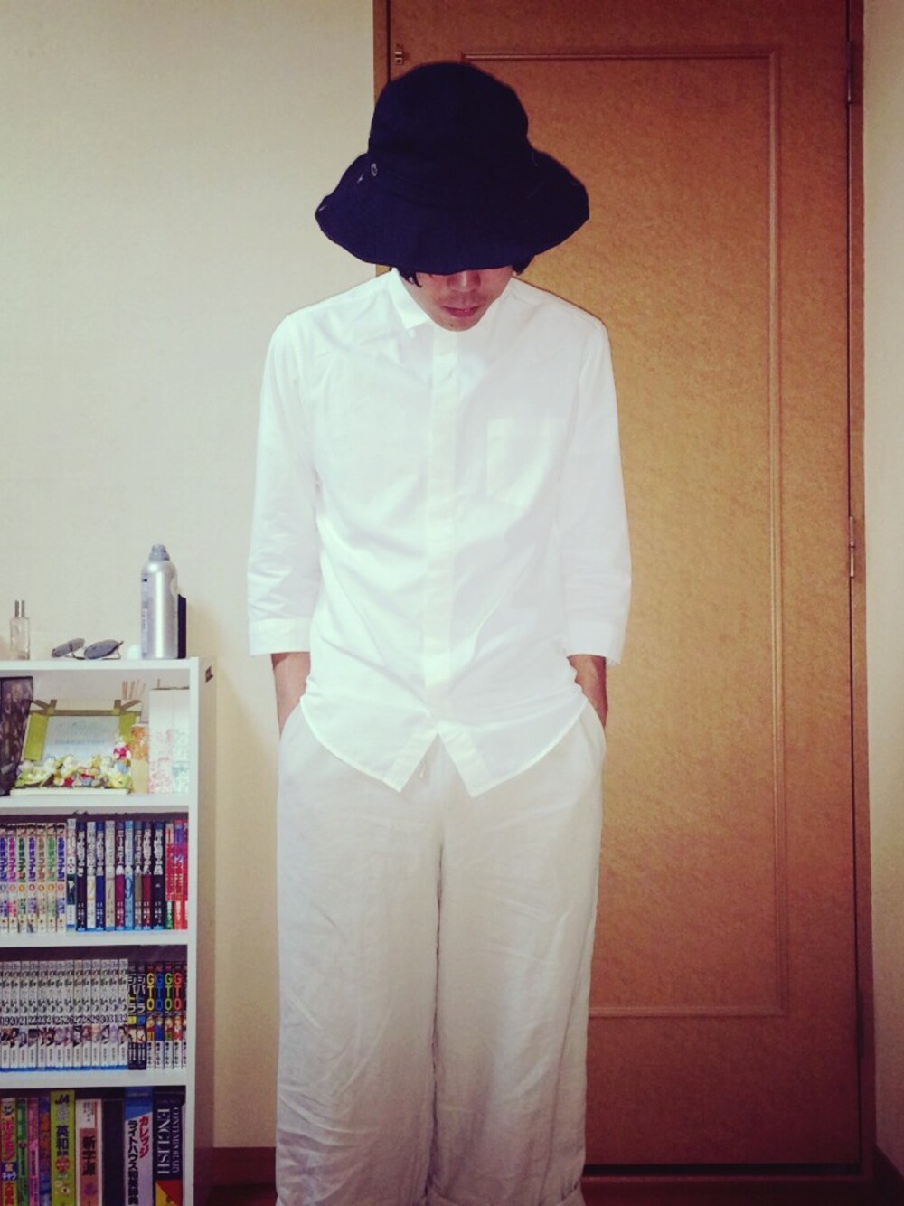 綺麗な七分袖シャツとワイドパンツで緩やかなAラインシルエットを作りました。 足元はカッチリとレザー履きたいです。