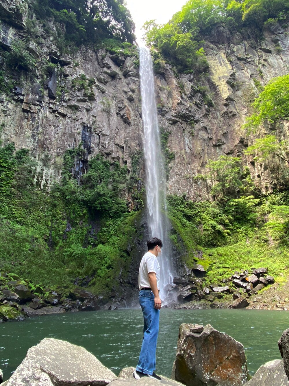 ブルー系のデニムパンツ、ブラック系のスニーカー、ホワイト系のTシャツ/カットソーを着用したメンズの夏コーディネートの1枚目の写真