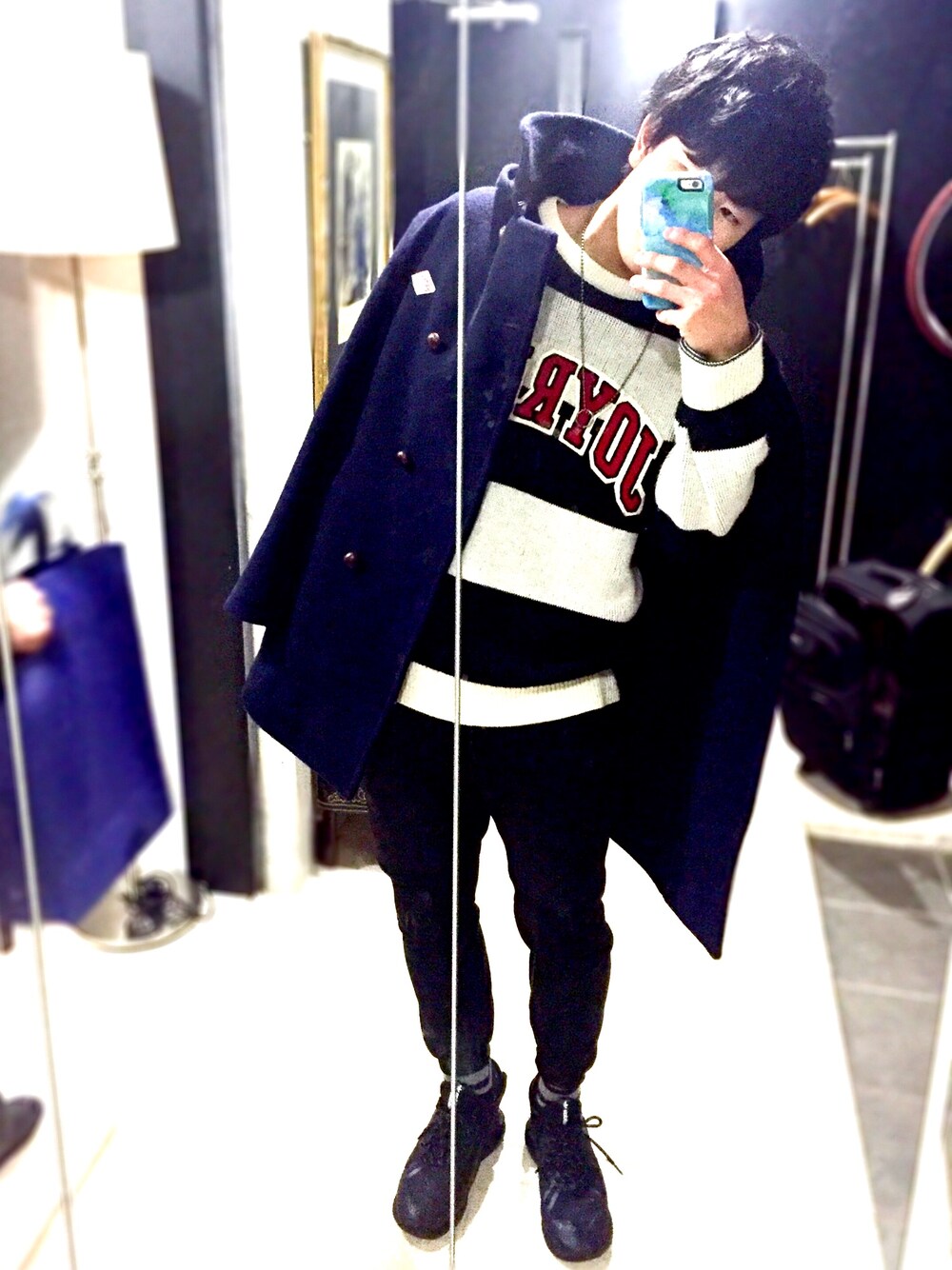 母親と白黒の太ボーダーニット被った。