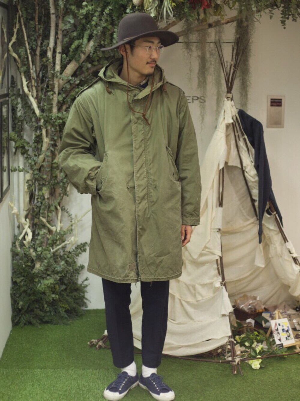 ミリタリースタイル M51にハット。イタリア軍のデッキシューズにスラックスパンツを合わせて少し綺麗に。