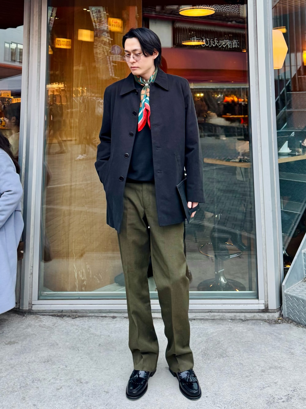 アイウェア: Kearny@Transistor(金沢) スカーフ: ブランド不明@伊勢丹(新宿) コート: agnes b.古着@Neverknows(代々木上原) ニット: H Beauty & Youth@H Beauty & Youth(青山) スラックス: 古着@Neverknows(代々木上原) ローファー: G.H.BASS@G.H.BASS(丸の内) クラッチバッグ: 土屋鞄@土屋鞄(六本木)
