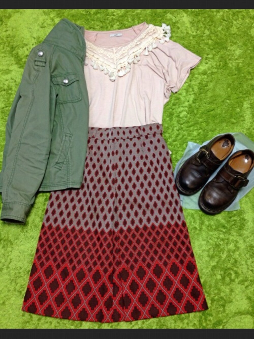 フリンジのついた服が好きで見つけるとほしくなってしまいます… ボヘミアン調のものってかわいいですよね! 4色展開でしたが、インディゴともホワイトとも合わせやすそうなピンクベージュにしました。 古着スカートの赤とも相性いいです◎ まだ肌寒いときもあるのでミリタリージャケットを羽織っています 足首が出るときはゴツめの靴がお気に入りです。