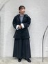 チャコールグレーのダークトーンに、マフラーとインナーのブルーが映えるコーデです🫐 柔らかい質感のカバーオールは、裏地のストライプが見えるように袖を折り上げても◎ ゆとりのあるシルエットなので、中に厚手のニットを仕込んだり、マフラーや手袋であたたかさをプラスするのがこれからの季節におすすめです🧣
