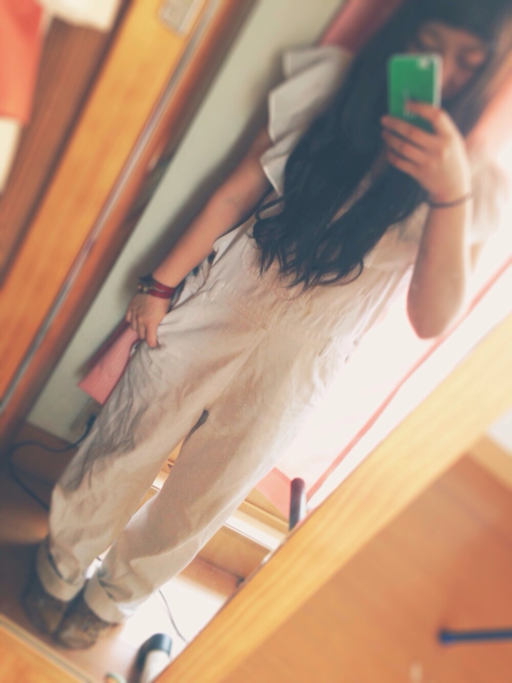 オカンから譲り受けた古着の白オーバーオール これオカンがわたしをお腹に宿してた頃に古着で高値で買うたんやって それを今わたしが着れるってとてもハッピーや! そんな感じでオールホワイトコーデにしてみました