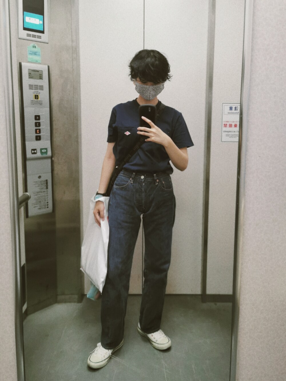今日のコーデ このパンツ激小さくて古着で買ったけど、もう破けそう、怖い ダントン可愛い