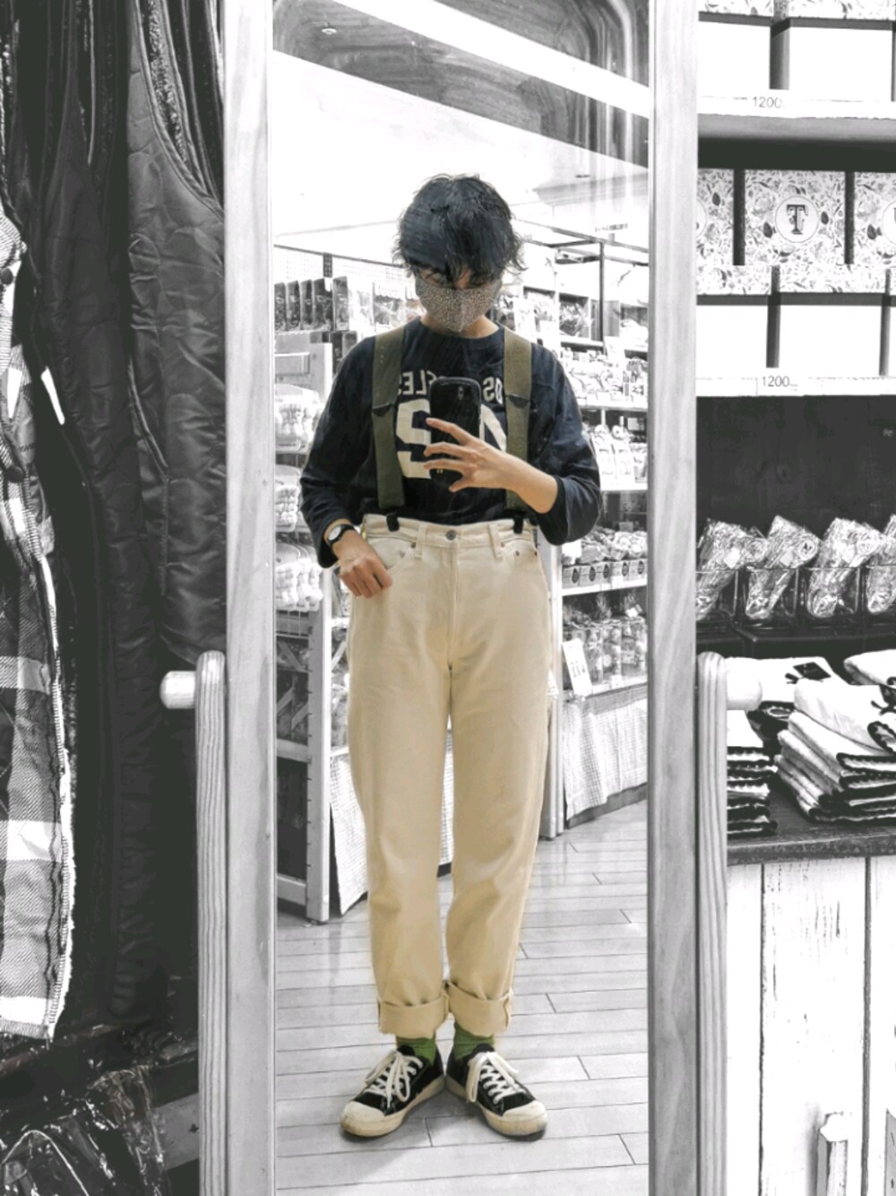 今日のコーデ 土砂降りの雨と知らず、白のパンツ履いた私、強い。 ちなみに全部古着。 靴下、キミドリなの可愛いんだよ〜。