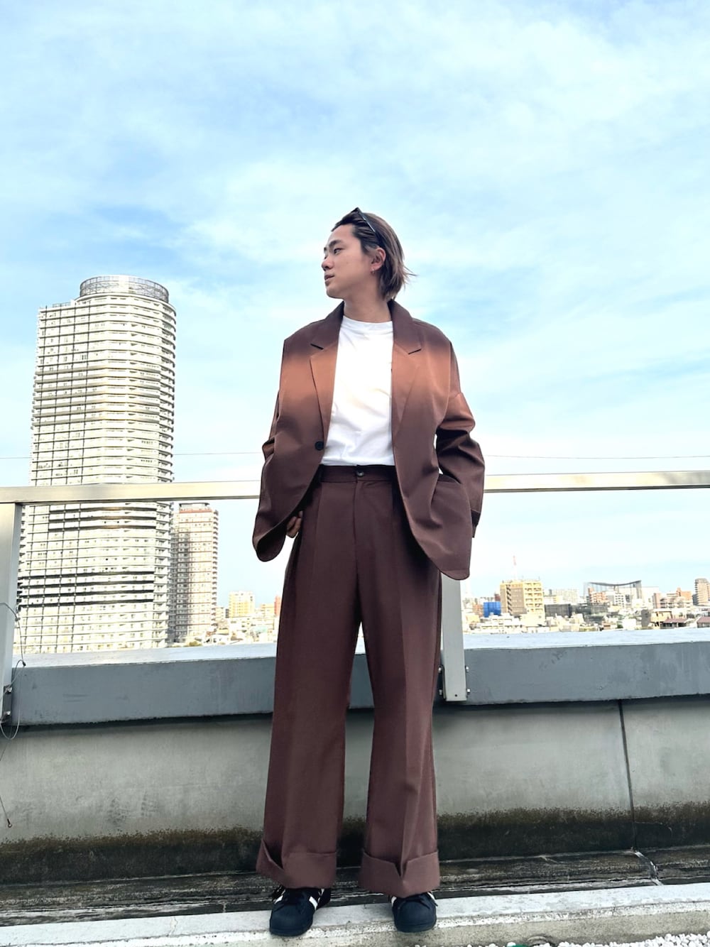 keitaのテーラードジャケット「【aimoha Men's】 薄手テーラードジャケット (OG)【セットアップ対応】 (LR)」を使ったコーディネート