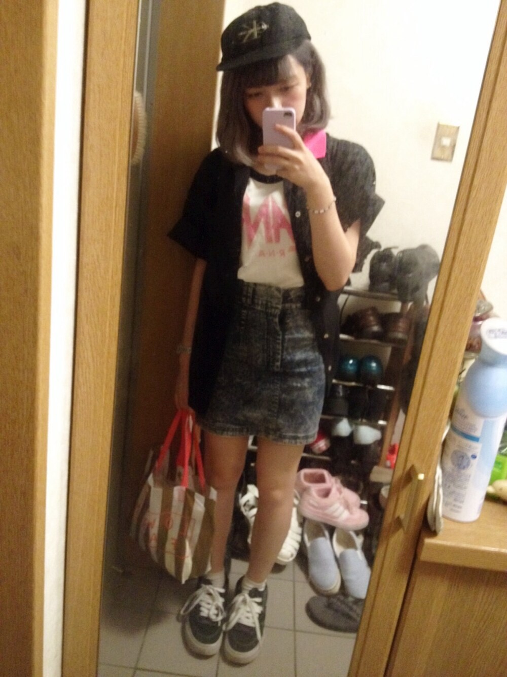 ボウリングシャツ:USED スカート:もらいもの 撮り忘れましたが、バックには くまちゃんの刺繍があります🐻 それがめちゃくちゃかわゆいのです♡