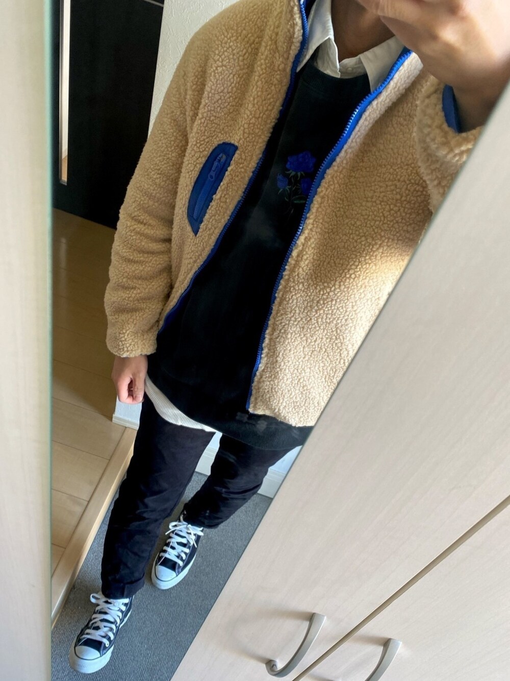 よきのブルゾン「もこもこ シープボア / リバーシブル ジップアップ スタンドカラー ブルゾン」を使ったコーディネート