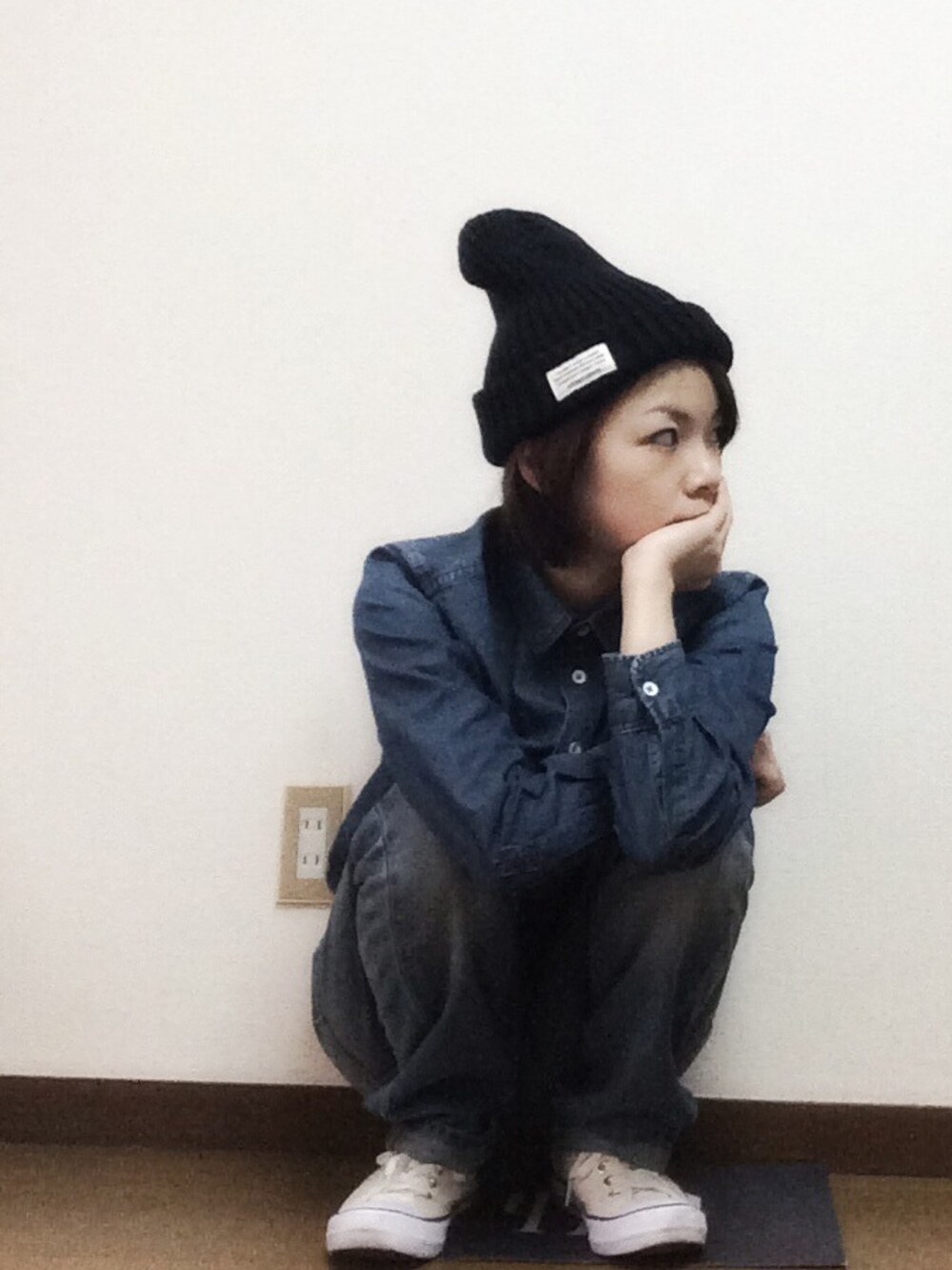 ブルー系のシャツ/ブラウス、ホワイト系のスニーカーを着用したレディースの冬コーディネートの1枚目の写真