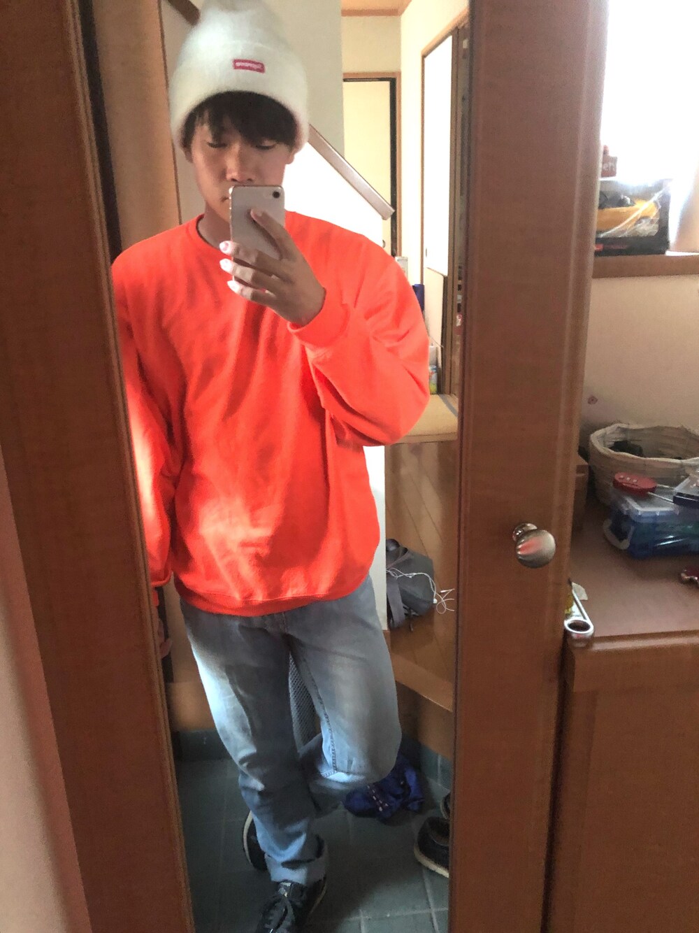 ひさびさwear!! 秋コーデです!Supのニットがワンポイントポイントになっております。 オレンジスウェットがいい感じにオシャレ感を出してくれます笑