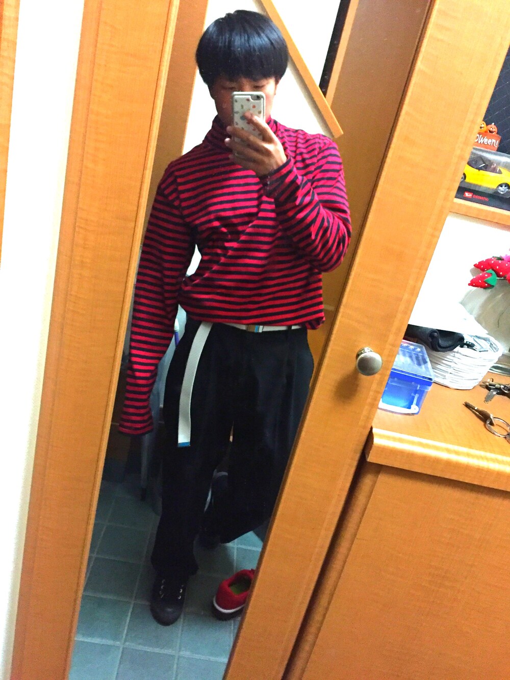 ボーダーをシャツインさせてセンスありそうな感じにしました。白のガチャベルト、大きめボーダー、ワイドパンツでユルさMAXです。