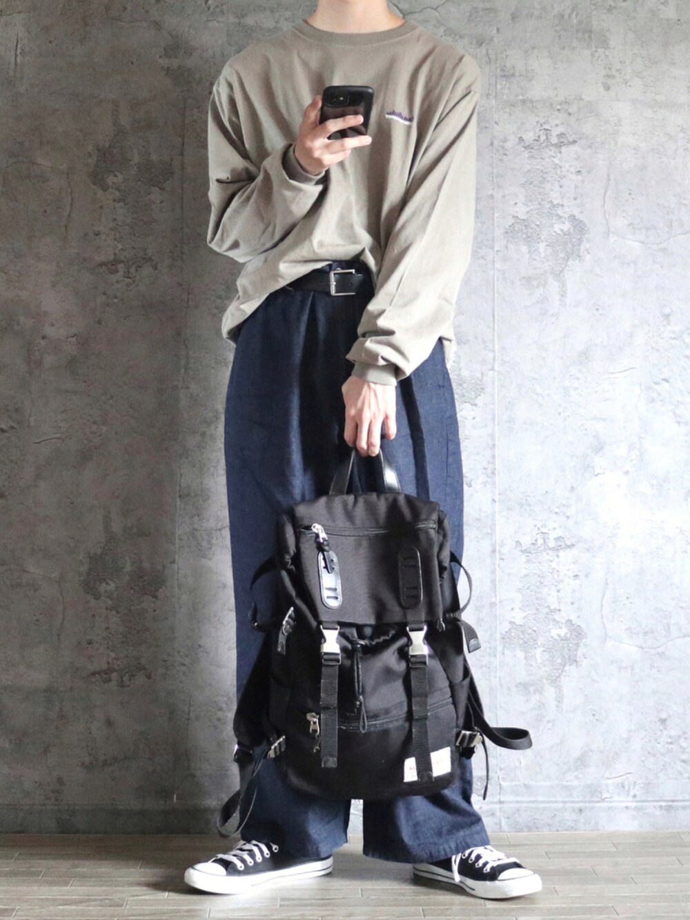 ベージュ×ネイビー。 ベージュをネイビーのデニムと合わせてカジュアルに。フロントタックインで長袖との アンバランス感を出すとより可愛いかっこよく。