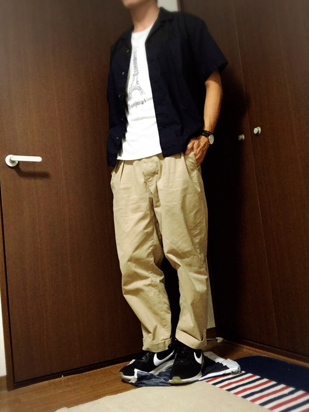 欲しいって言ってたオープンカラーシャツ、その日にたまたま良さげなの見つけた😍 また買ったから無理やり着てみた奴🤙☝️☝️☝️☝️ 前開けたとき無地Tだとちょっと寂しかったんで柄付きにしましたーん👕 個人的にベージュのワイドパンツ気に入ってます🤣