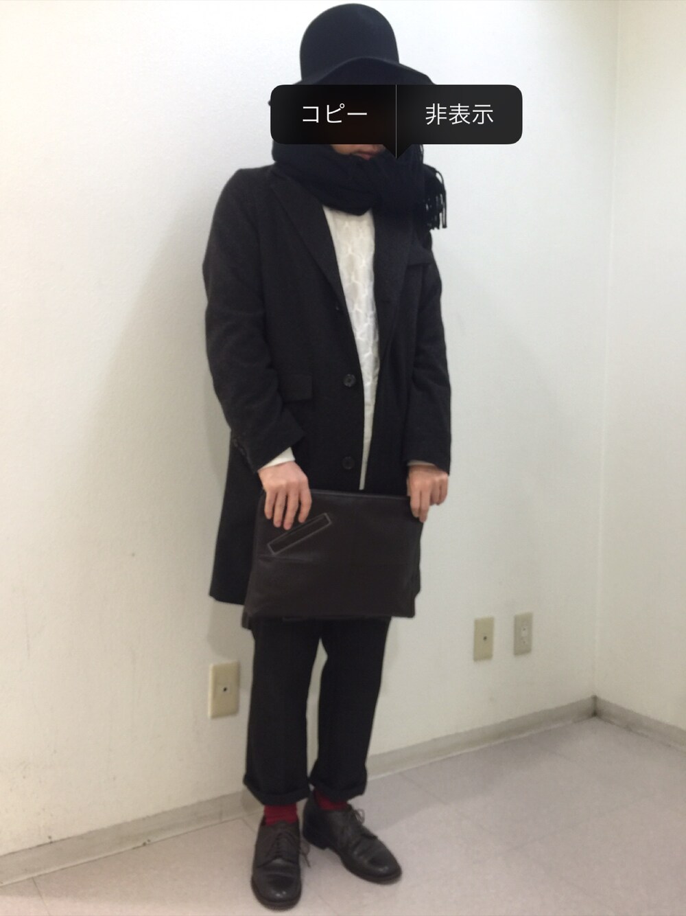 この間出掛けた時のコーデです nichi.のセットアップを使ったキレイめコーデです 茶系のセットアップ+マフラー、帽子を黒で全体的にシックな色感でまとめて、靴下に赤で差し色って感じのコーデですかね笑 この時期はやっぱ茶系が着たくなりますね! あたたかみのあるコーデで行きたい!