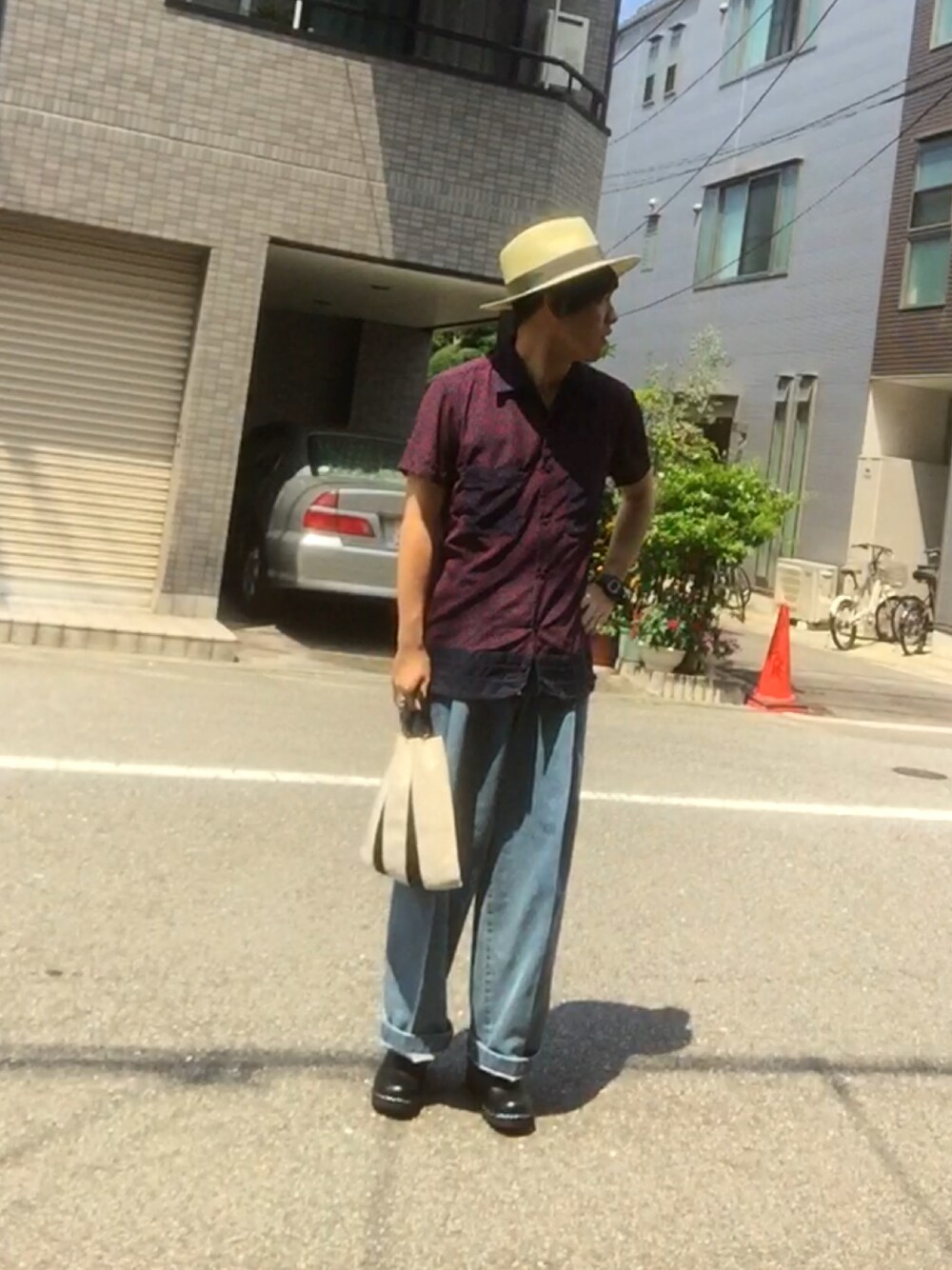 ネオンサインのディッキー買いに行きマース 開襟シャツ+ワイドデニムのトレンドコーデ ストローハット+サボで夏の風味を添えて