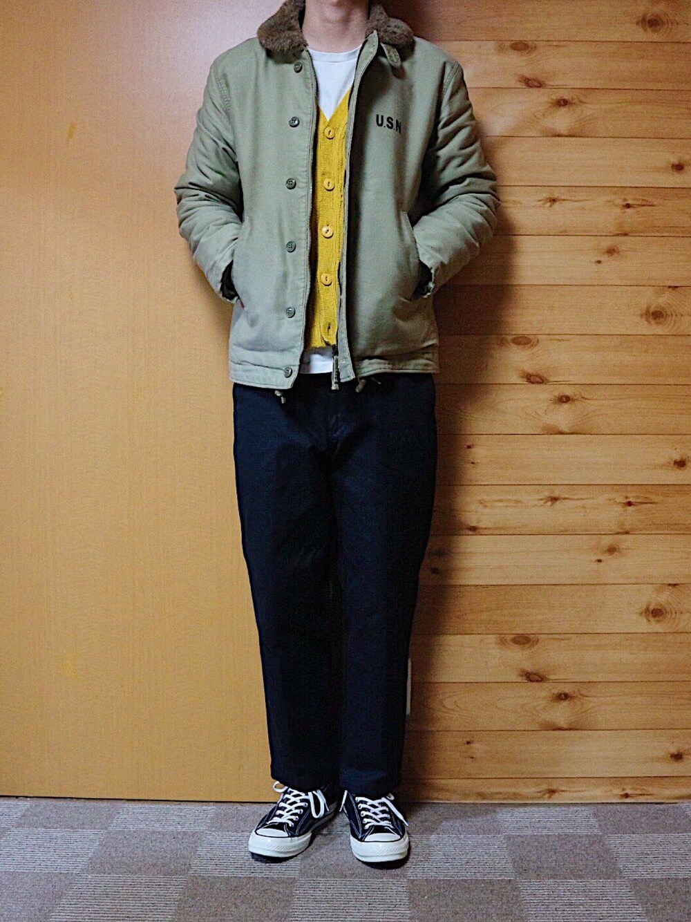 アウターはレプリカのN-1 (中古で6,000円) カーディガンはノーブランド(中古で900円) インナーはGUのロンT (1,000円) ボトムスはUNIQLO Uのチノパン (セールで1,990円) スニーカーはコンバースのCT70 (10,000円) スニーカーだけやや高めですが、それでもトータルで2万円 (スニーカーを除けば1万円)のプチプラコーデ。 このN-1はかなり安く手に入りましたが、とにかく防寒性が高くてお気に入りです。