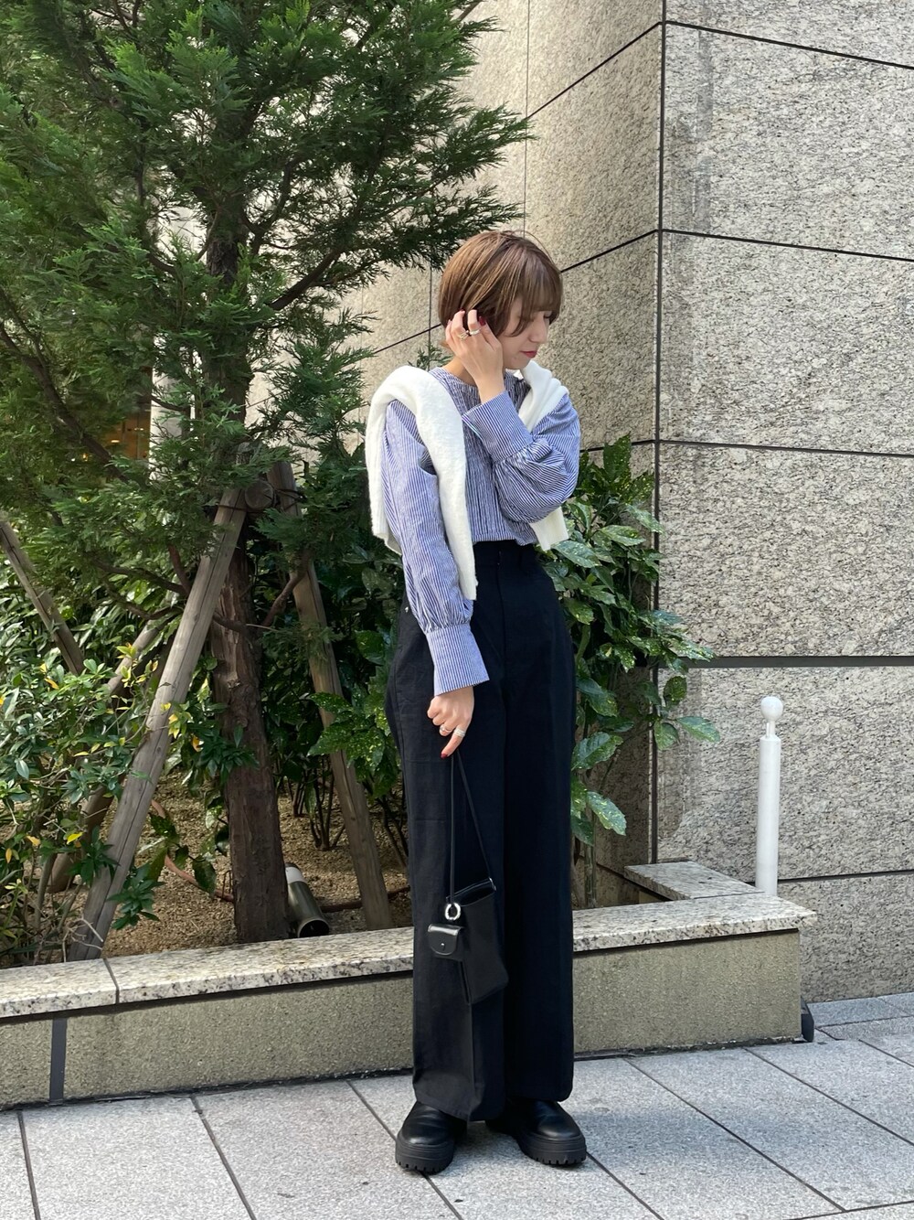ストライプシャツコーデ♡ ピンタックボリュームシャツ / navy 前後両前で着ていただける優秀シャツ◎ 襟なしで女性らしく着れるストライプです! サイドはスリットが入ってるのでインはもちろんですが アウトで着てもスッキリ見えしますよ! カフスが長めなのも可愛いポイントです♡ ポケットショートカーディガン / off 寒暖差が激しい今にぴったりです! お昼間はサラッと肩掛けで、夜は羽織って お使い頂けます! ショート丈なのでハイウエストのボトムと合わせると スタイルよく見せていただけます! スラブコットンランチパンツ / black (size1) ハイウエストでセンタープレスも入ってるので美脚見え間違いなしのパンツです! 裾を折って着ていただくのも可愛いです! サイドゴアブーツ / black (size37) ごつめのシルエットなので美脚見えになるのと 足首はフィット感があるので歩きやすくなっています! 23.5cmで37を履いていますよ! 携帯ウォレットバッグ / black お財布が一緒になっているのでパッと出かける時に これ一つで纏まります◎ AirPodsが入るポーチ付きです! insta >> kg_ayk